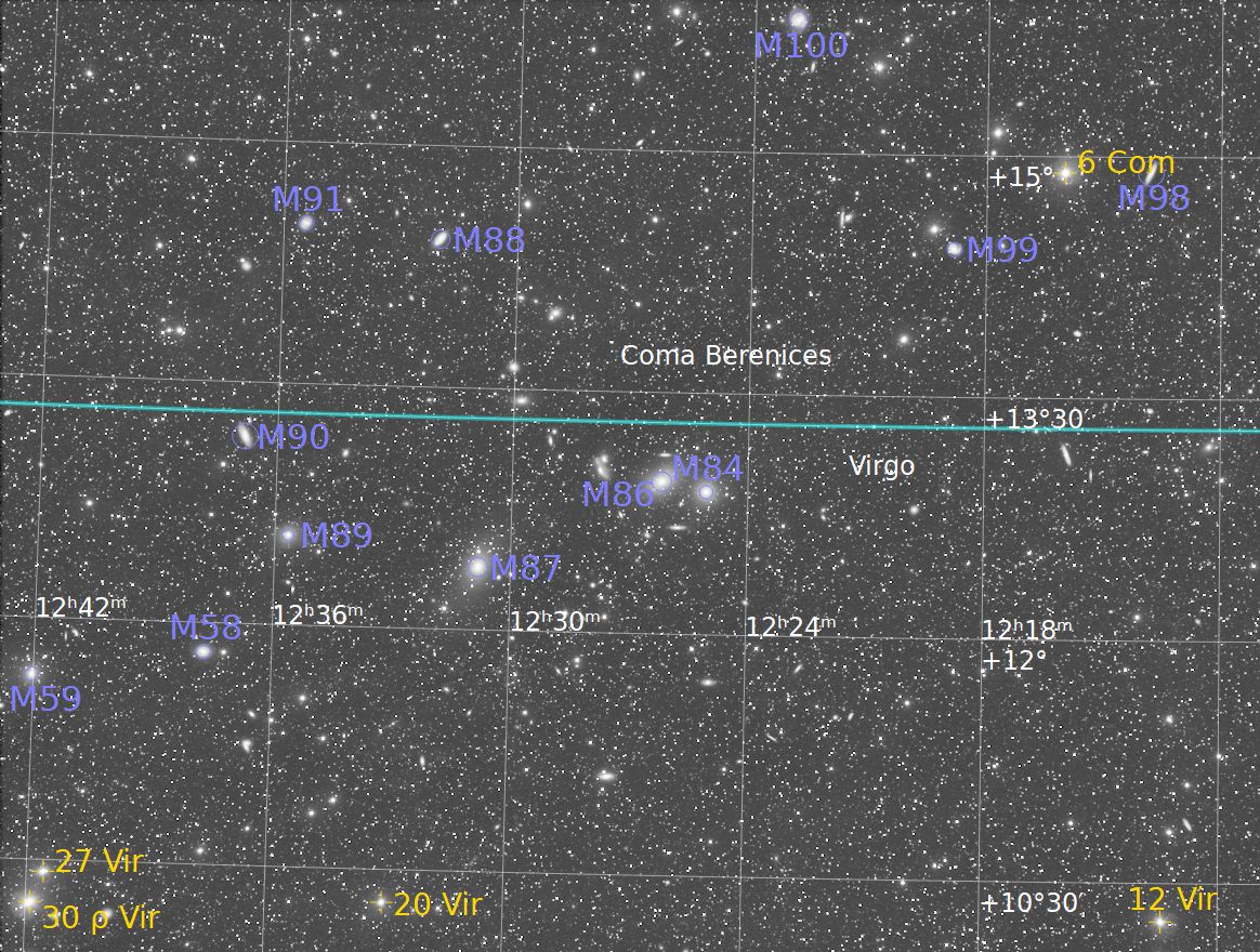 Im Bildfeld sind einige hellere Galaxien zu sehen. Dabei handelt es sich um 12 Messiergalaxien. Des weiteren tummeln sich noch zahlreiche Galaxien, welche im NGC Katalog erfasst sind. Galaxien, welche nur mehr sehr klein und lichtschwach erkennbar sind, dürften wahrscheinlich 1 Milliarde Lichtjahre weit entfernt sein.