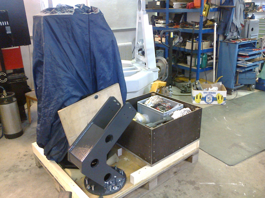 Rechts über der Holzkiste (voll mit Werkzeug) kommmt dann noch der PC Schrank - dieser wurde dann mit dem Hauptspiegel und sämtlichen PC/Netzteilen bestückt